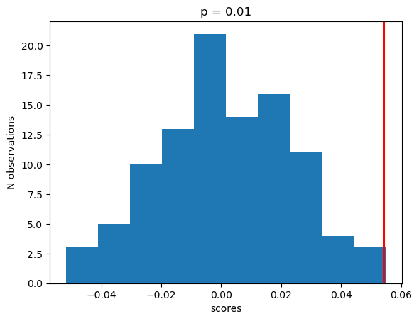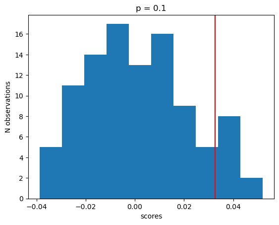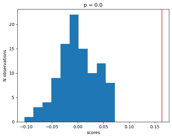 | Compute the p-value | p = (scores_permute > score).sum() / len(scores_permute) |