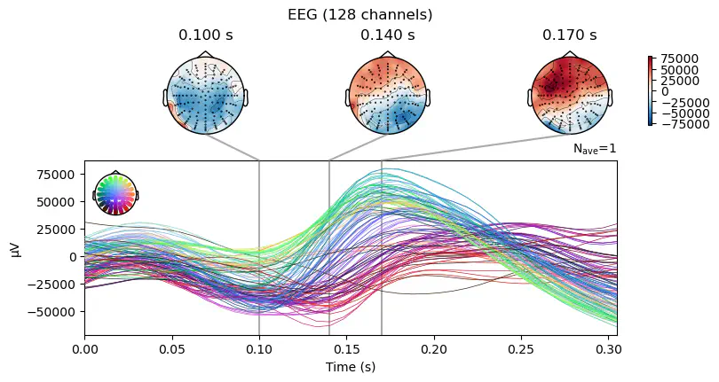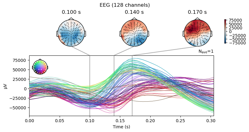 | Plot an Evoked object with topomaps at specific times | evokeds[0].plot_joint(times=[0.1, 0.2]) |