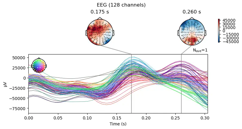 evokeds[0].plot_joint(times=[0.175, 0.26]);No projector specified for this dataset. Please consider the method self.add_proj.Exercise: Plot the 4th element in evokeds.