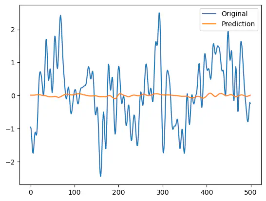 plt.legend()Exercise: The cell below fits the same model but with . Predict using the envelope and plot a segment of the predicted and original response. How did reducing affect the model’s prediction?