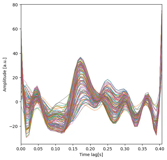 | Get the cross-validated score | score = mtrf.stats.crossval(trf, stimulus, response, fs, tmin=0, tmax=0.4, regularization=10) |