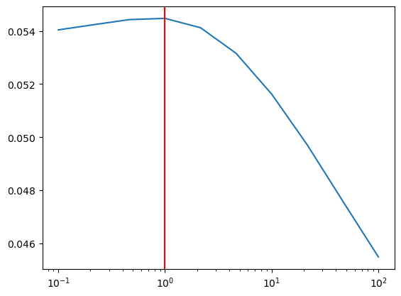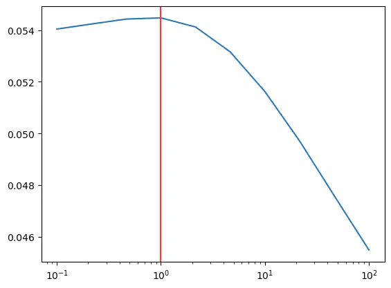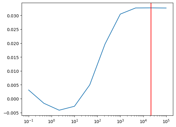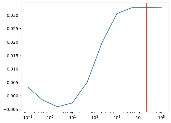 plt.axvline(x=trf.regularization, color="red")Exercise: The cell below defines a function for calculating . Create a forward TRF with metric=rsquared to predict the response from the envelope and fit it with cross-validation. How does the curve of scores differ from the previous example using Pearson’s correlation?