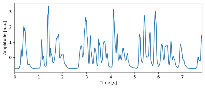 ax.set(xticks=xticks, xticklabels=np.round(xticks / fs, 1), xlabel="Time [s]", ylabel="Band");We can also average the spectrogram across bands to obtain the acoustic envelope which describes the total energy in the speech signal across time.