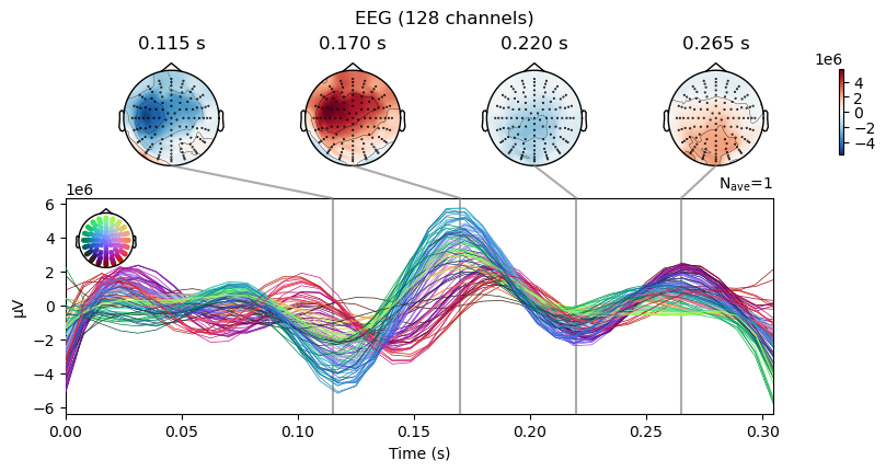 evokeds[0].plot_joint(times=[0.115, 0.17, 0.22, 0.265]);No projector specified for this dataset. Please consider the method self.add_proj.Example: Estimate the accuracy of the trained TRF with average=False to get one score for every channel and plot it as a topographical map using the channel positions from evokeds[0].info. Where are you seeing the most accurate predictions?