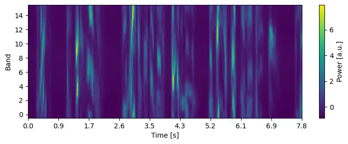 ax.set(xlabel="Time [s]", ylabel="Amplitude [μV]", xlim=(t.min(), t.max()));The spectrogram contains the power of the speech signal divided into different bands across the frequency range that is relevant for human speech (80-8000 Hz).