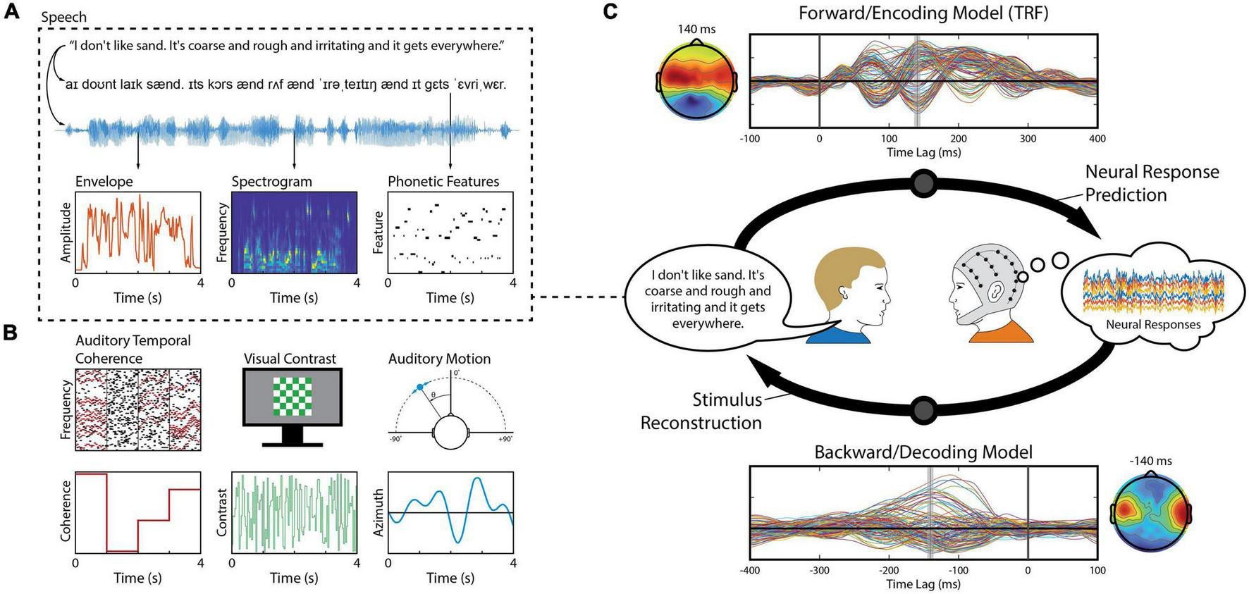 The model can be applied in two directions: as a forward (or encoding) model, predicting brain responses from speech features, or as a backward (or decoding) model, reconstructing stimulus features from the neural response. Forward models can be used to identify which speech features are encoded in the neural response as shown for example in Di Liberto et al. (2015). Backward models can be used to measure attention in a selective listening task by testing which auditory stream can be decoded more accurately from the neural response as shown in O’Sullivan et al. (2014).