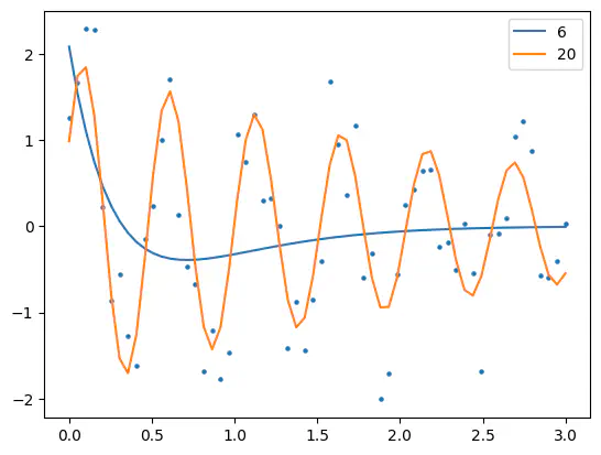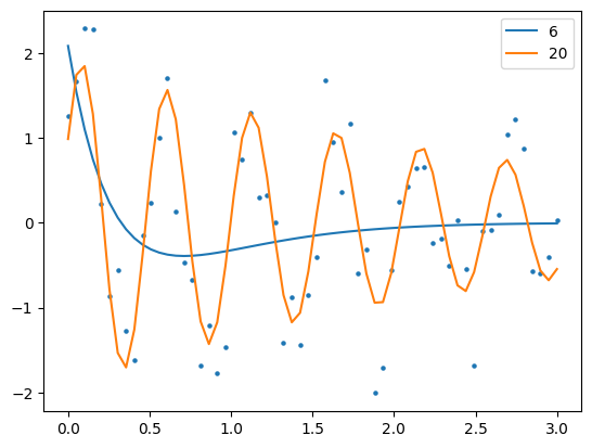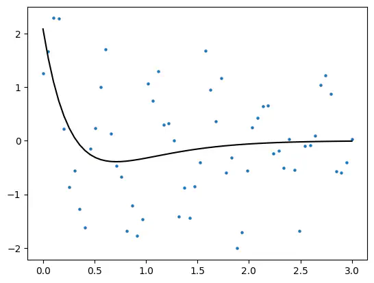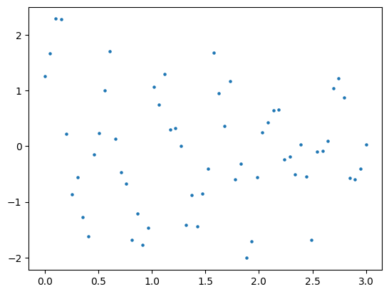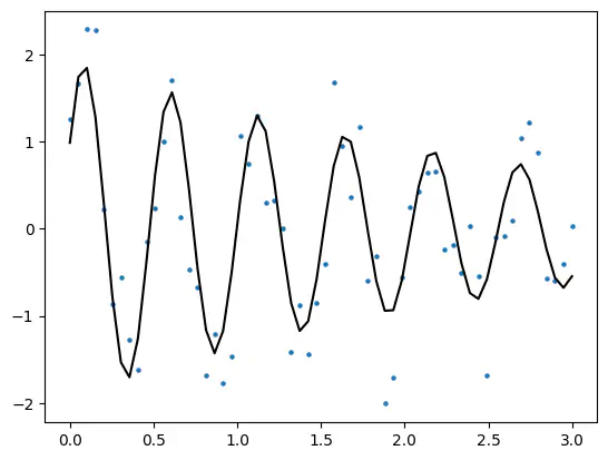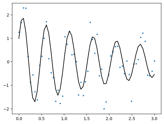 plt.scatter(x,y, s=5)Exercise: Fit the utils.damped_sine function to the data x, y and plot the model’s prediction together with the original data.