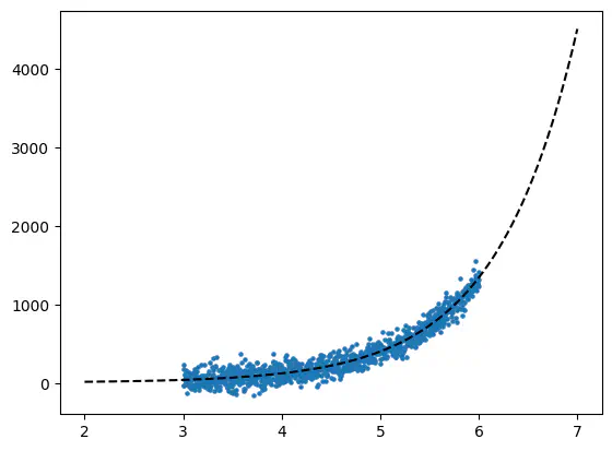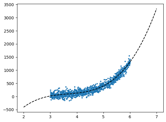 plt.plot(x, y_fit, linestyle="--", color="black")Example: Create a new vector of x coordinates x_ext with 100 points between 2 and 7 and extrapolate the model to points outside of the range of the original data.