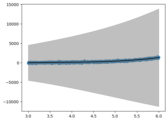 plt.fill_between(x, y1=y_ci_low, y2=y_ci_high, color="gray", alpha=0.5)Exercise: Fit a polynomial model to the data and compute the 95% confidence interval. Then plot the model’s prediction together with the original data and highlight the confidence interval as a shaded area around the curve. What does this confidence interval tell you about the reliability of the model?