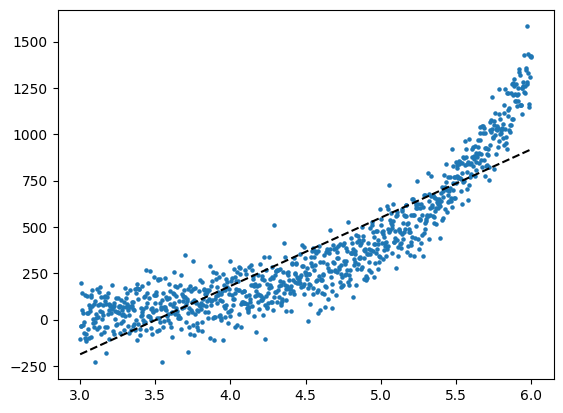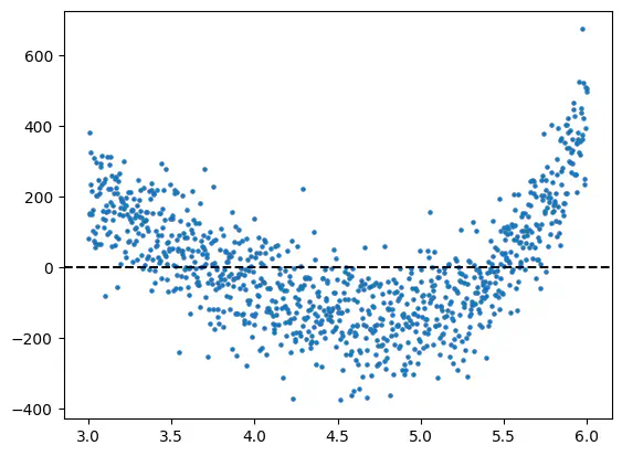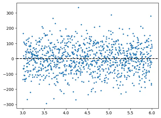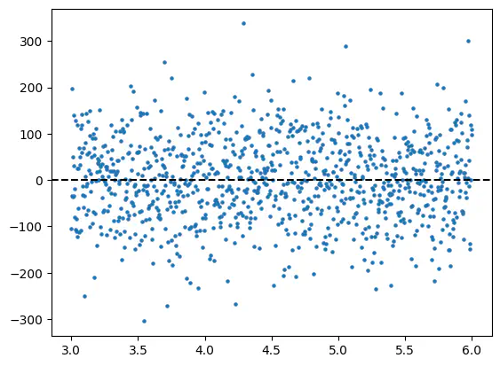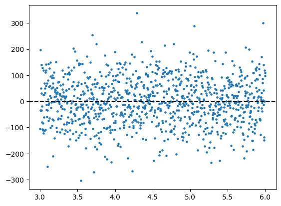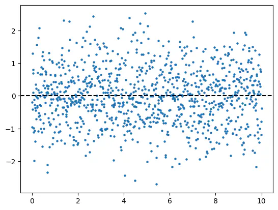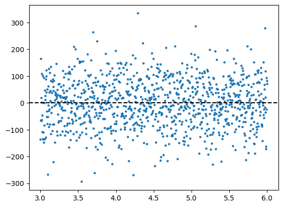 plt.plot(x, utils.linear(x, *popt), color="black", linestyle="--")Exercise: Compute the model residuals and create a scatter plot of the residuals against the data points x and add a horizontal line at y=0 for reference.