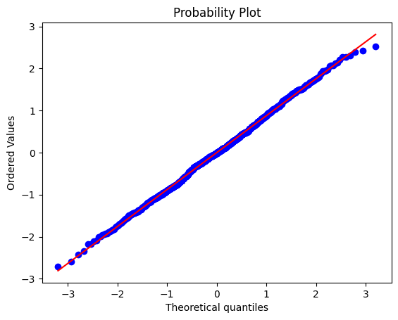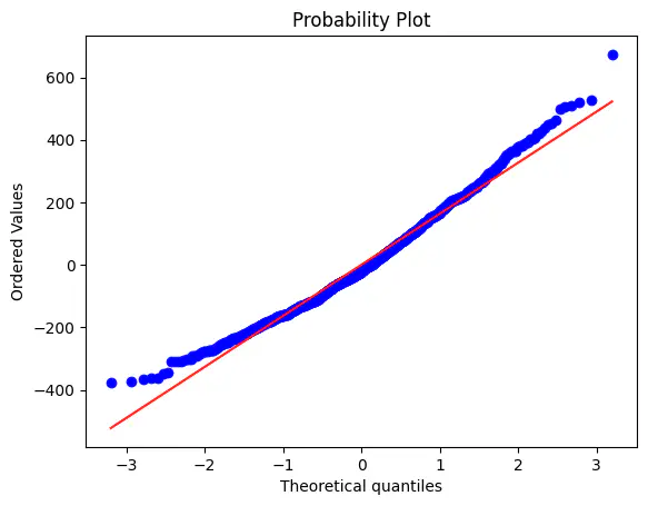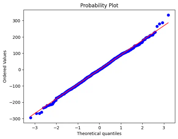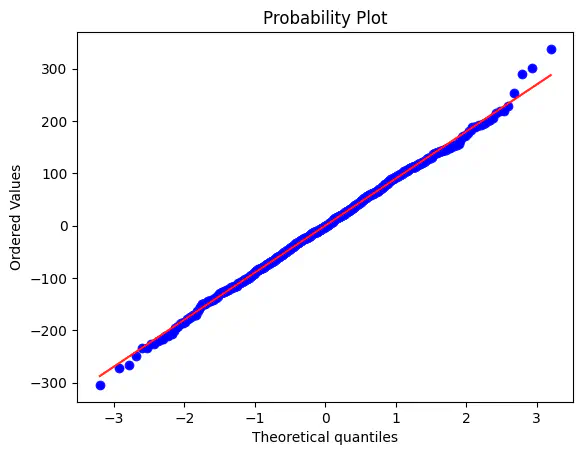 plt.axhline(y=0, color="black", linestyle="--")Example: Create a quantile-quantile or Q-Q plot that compares the distribution of the residuals agains a normal distribution. If the model fits the data well, the points should scatter around the red line.
