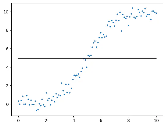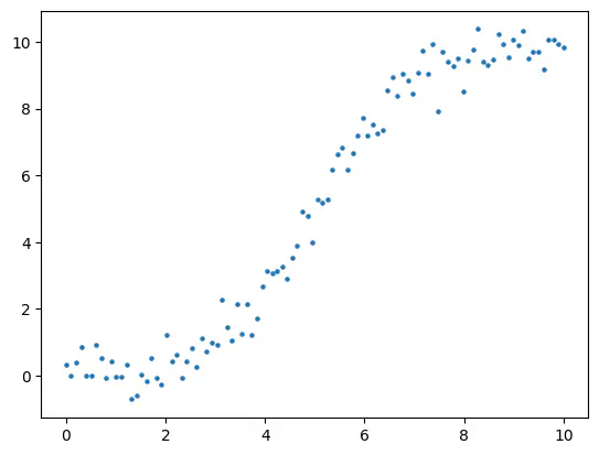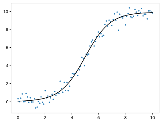 plt.scatter(x,y, s=5)Exercise: Fit the utils.logistic model to the data x, y and plot the model’s prediction together with the original data. What does the warning message tell you? Does the curve fit the data at all?