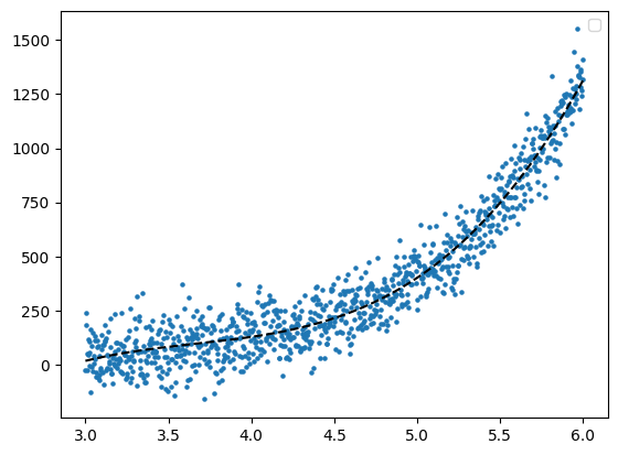 plt.plot(x_ext, y_fit, linestyle="--", color="black")Exercise: Fit the data points x, y using the utils.polynomial function and return the optimized parameters popt and their covariance pcov.