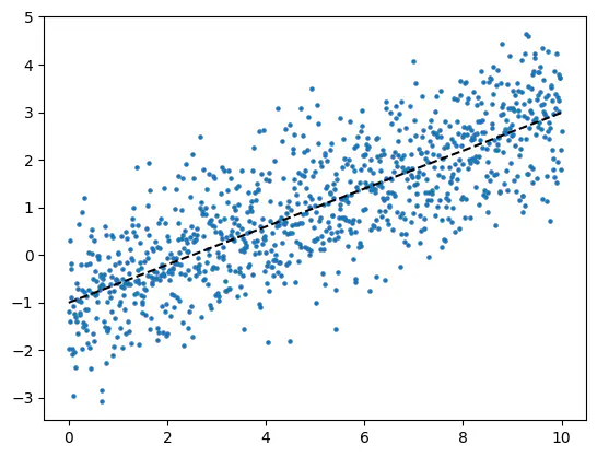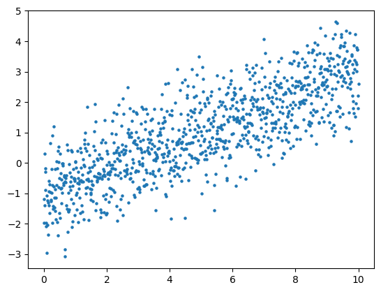 plt.scatter(x, y, s=5)Example: Use curve_fit fit the utils.linear function to the points x, y and return the optimized parameters popt and their covaraince pcov.