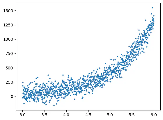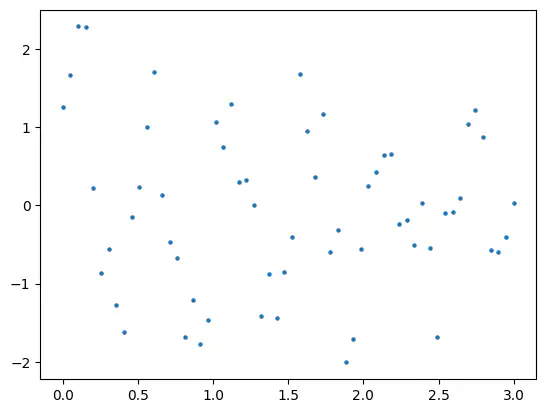 plt.scatter(x, y, s=5)Exercise: Use curve_fit with the function that is the best fit for the data from the previous exercise and plot the data together with the fitted function. If you are unsure which function to choose, try different ones.