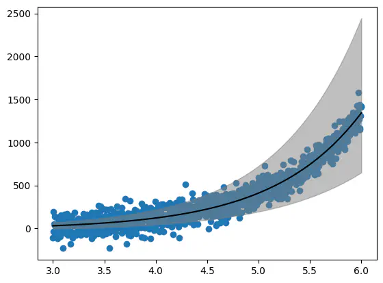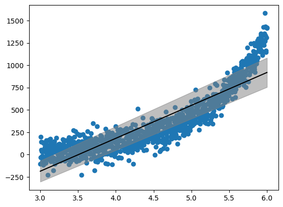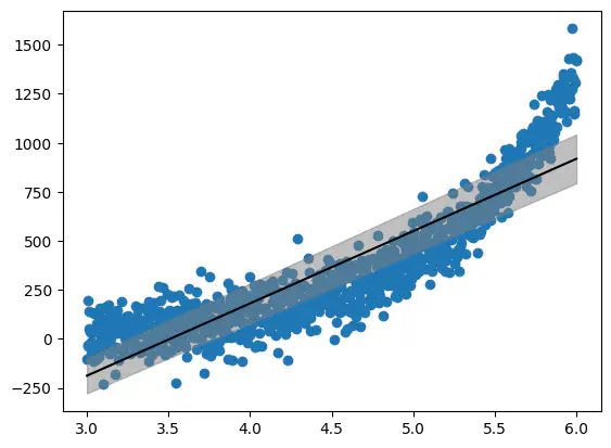plt.fill_between(x, y1=y_ci_low, y2=y_ci_high, color="gray", alpha=0.5)Exercise: Compute and plot the 99% confidence interval for the same linear model.