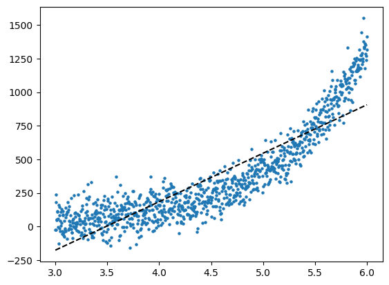plt.plot(x_ext, y_fit, linestyle="--", color="black")Exercise: Use the function utils.generate_data2() to generate a new set of x and y data points and plot them with plt.scatter. Which function would you choose to fit to this data?