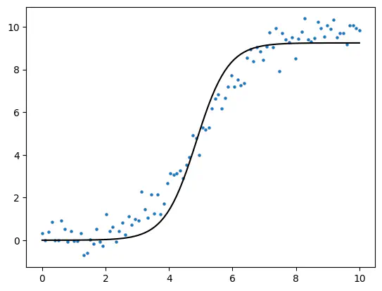 plt.plot(x, y_fit, color="black")Exercise: Modify the bounds to force the growth parameter (the second parameter of the logistic function) to be greater than 2 and rerun curve_fit. Then, plot the model’s prediction together with the original data.