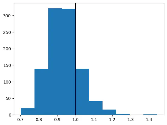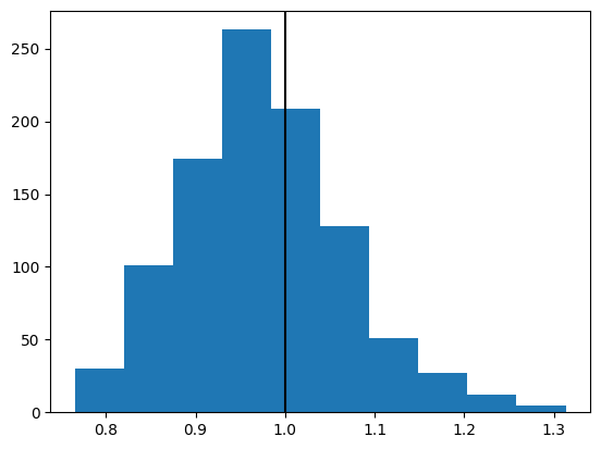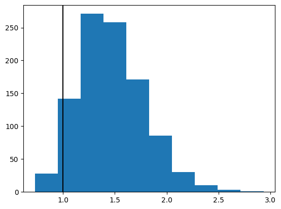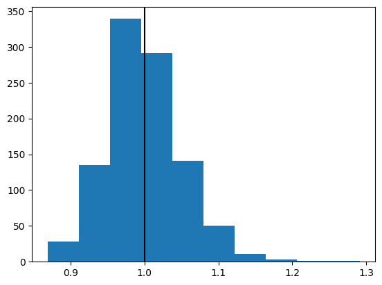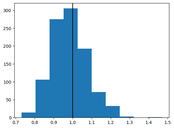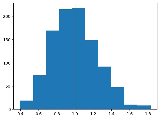 plt.axvline(x=1, color="black")Exercise: Simulate a neuron using a StationaryPoissonProcess with refractory_period=2*pq.ms and generate 1000 spike trains. Then, compute the cvs and plot them in a histogram. Add a vertical line at x=1.
