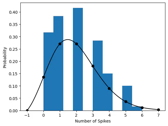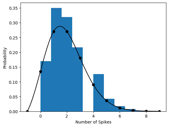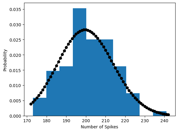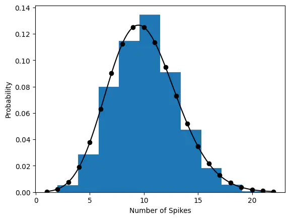 )Exercise: Generate 1000 spike trains from the same neuron, get the number of spikes for every spike train and plot a histogram with their density together with the theoretical poisson distribution.