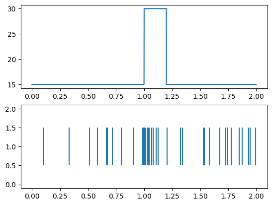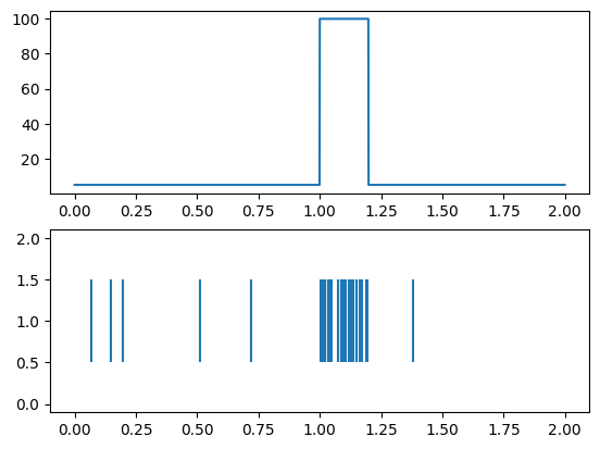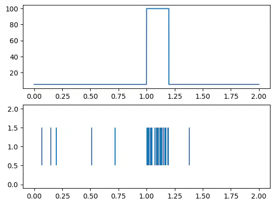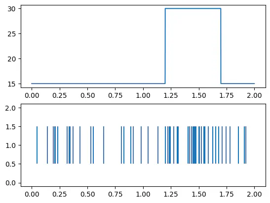 While the Poisson process allows us to simulate randomly spiking neurons, in many situations, we want to simulate neurons that respond to some particular event. This can be done using a non-stationary Process which works just like the regular poisson Process, except that its rate varies across time. By setting the time varying rate, we can simulate neurons that respond with bursting at specific points in time.