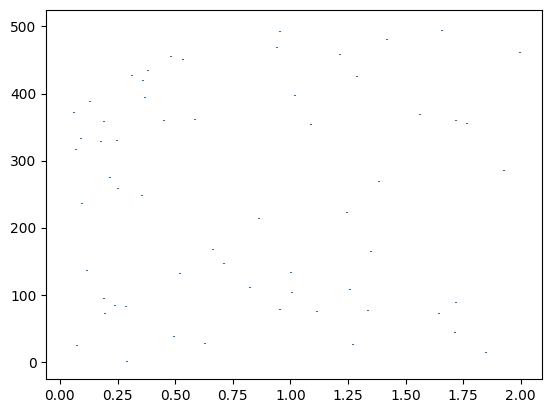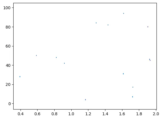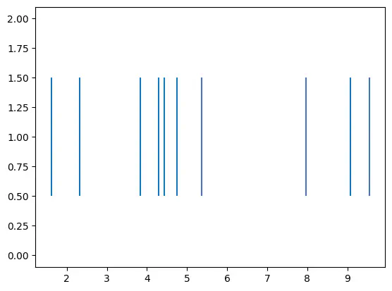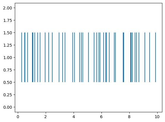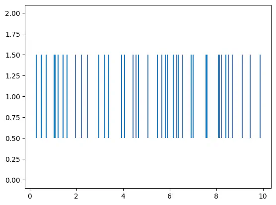 plt.eventplot(st.times)Exercise: Simulate a neuron as a StationaryPoissonProcess with a rate=0.1*pq.Hz and t_stop=2*pq.s. Then, generate a spike train st and plot it with plt.eventplot. Did you see any spikes?