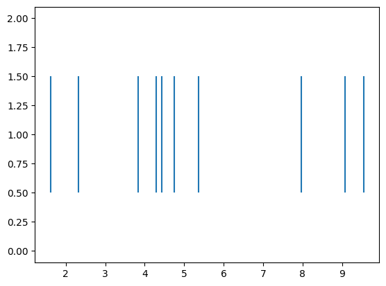 plt.eventplot(st.times)Exercise: Simulate a neuron as a StationaryPoissonProcess with a rate=1*pq.Hz and t_stop=10*pq.s. Then, generate a spike train st and print its length (i.e. the number of spikes).