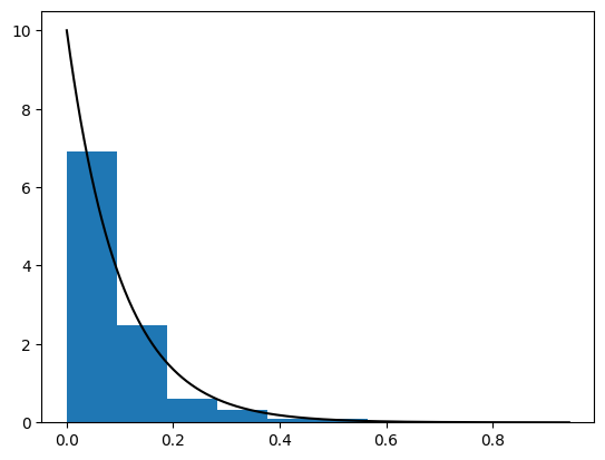 isis.mean()array(0.09330903) * sExample: Plot a histogram with the densities of the observed ISIs isis.magnitude together with the theoretical exponential distribution that describes the expected ISIs for a neuron with the given rate.
