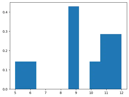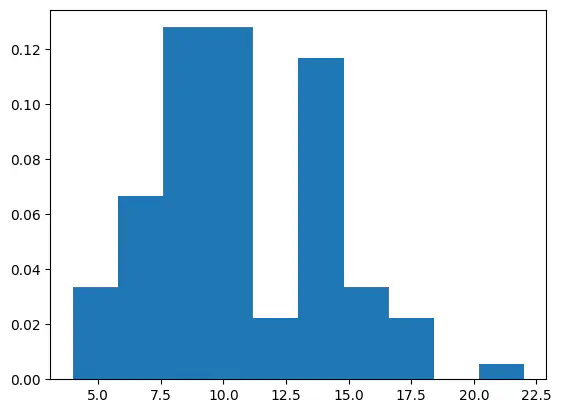 plt.hist(n_spikes, density=True)Exercise: Generate 100 spike trains from the same neuron, get the number of spikes in every spike train and plot their density as a histogram.