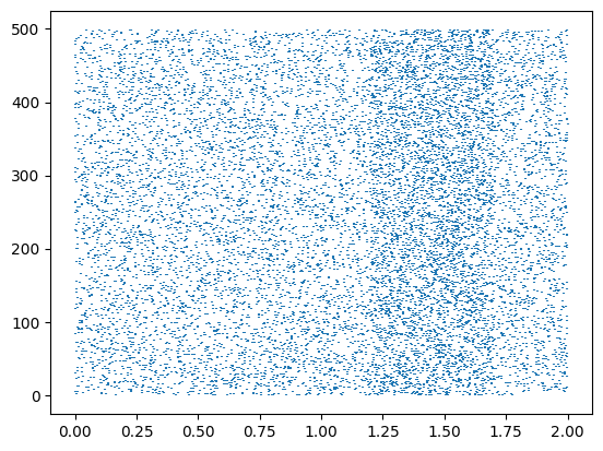 plt.eventplot(st.times)Exercise: Use utils.NonStationaryPoissonProcess with rate=15*pq.Hz, t_stop=2*pq.s and burst_rate=30*pq.Hz to simulate a neuron and plot its .rate_signal.