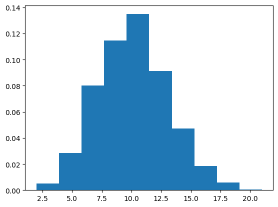 plt.hist(n_spikes, density=True)Example: Plot a histogram with the density of the observed number of spikes together with the theoretical Poisson distribution for a neuron with the given rate and duration.