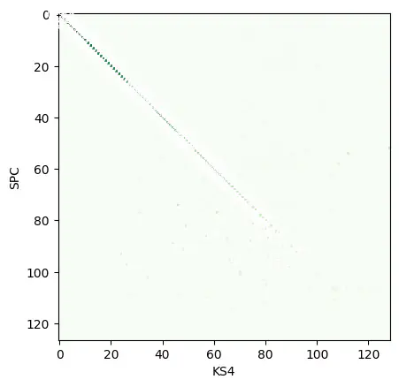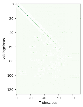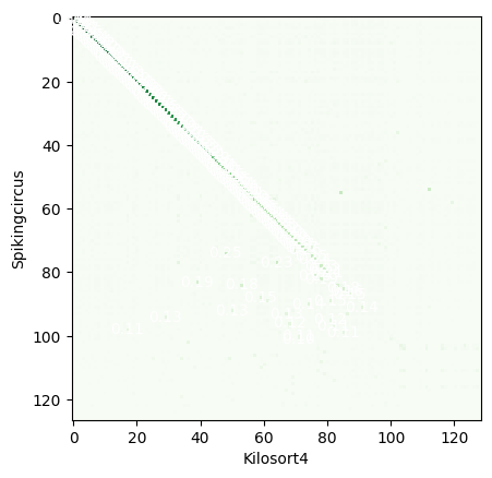 sorting_TDC = si.read_sorter_folder("results_TDC")Example: Compare the results from the Spikingcircus and Kilosort4 sorters using the "count" agreement methods and plot the agreement matrix. A clearly visible diagonal indicates that the sorters agree on a given unit.
