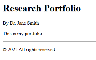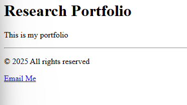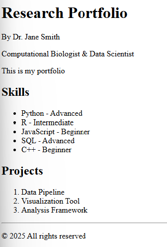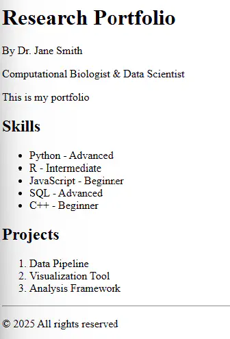 tagline = "Machine Learning Researcher"Contact information can be stored in variables instead of hardcoded in HTML. This makes it easier to update across the site.