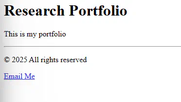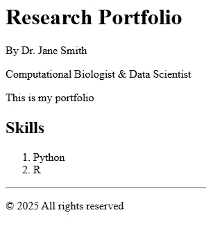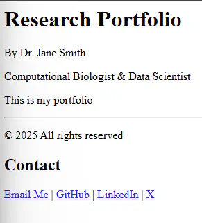 tagline = "Machine Learning Researcher"Contact information can be stored in variables instead of hardcoded in HTML. This makes it easier to update across the site.
